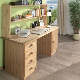 - Мебелите от масивен бор ще изглеждат добре в офиса. Това може да бъде бюро или компютърно бюро. Такива продукти могат да бъдат правоъгълни или ъглови. За уважаван собственик можете да закупите мебел с модерен античен декор, направен с патина, кракелур, резбовани елементи.