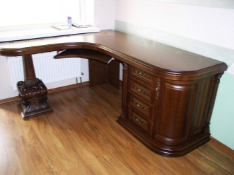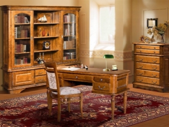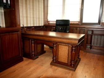 - Мебелите от масивен бор ще изглеждат добре в офиса. Това може да бъде бюро или компютърно бюро. Такива продукти могат да бъдат правоъгълни или ъглови. За уважаван собственик можете да закупите мебел с модерен античен декор, направен с патина, кракелур, резбовани елементи.