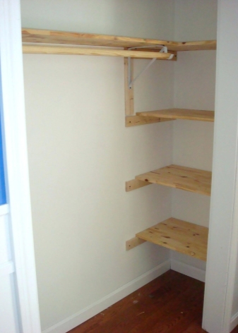 - Дървена конструкция с рафтове с кръгли ъгли, идеални за тесни килери.
