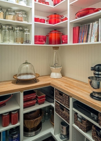 - Стелаж с ъглови рафтове е много удобен. Ясната организация позволява съдове за хранене, вино, хранителни стоки и кърпи за чай.