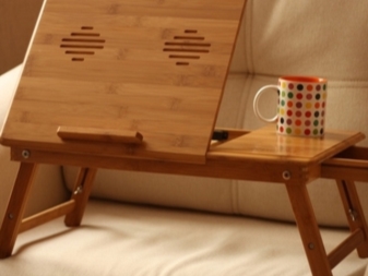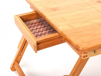 Стилна бамбукова маса, изработена от естествен материал. Благодарение на трансформиращия елемент, отделен от рамката на масата, е възможно да се осигурят най -удобните условия на работа. Масата в естествен цвят ще се превърне в удобно и цветно допълнение към интериора. Производителите също така оборудват модела с малко чекмедже, държач за чаши и други елементи..