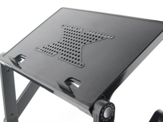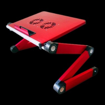 Удобна, практична и многофункционална трансформираща се маса в класически черен цвят. Този модел е изработен от метал. Дизайнът беше допълнен от специална система за фиксиране на лаптоп и стойка за подмишниците. В горната част на масата има и дупки за организиране на процеса на охлаждане..