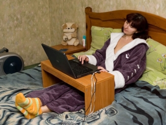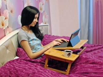 - Заслужава да се отбележи, че масата за легло ще помогне за намаляване на стреса върху гърба, шията и гръбначния стълб, когато използвате компютъра в леглото. Този параметър има положителен ефект върху производителността на труда..