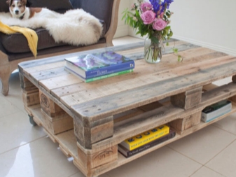 Изграждането на палети също може да бъде чудесен материал за проектиране на стилни масички за кафе. Можете да вземете един палет или да инсталирате 2-3 продукта, така че да станат пълноправен артикул. Тази маса за палети често е лакирана или боядисана и има колела..