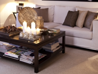 Масата за кафе ще помогне за завършване на декора на хола и тук тя може да се използва за повече от очевидното си предназначение. Можете да поставите напитки върху него и да поставите няколко лъскави списания, вестници или каталози на повърхността му, като по този начин внесете ярък акцент в интериора, комбинирайки всички тези аксесоари в едно цяло. По -често се предпочитат квадратни форми и правоъгълници: тези продукти са удобни за преместване, разгъване с дясната страна към гостите и стената. По-добре е да изберете материали за маси, които са устойчиви на удар и топлина..