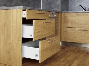 - Кухненските гарнитури обикновено се състоят от шарнирни шкафове с голям брой чекмеджета.
