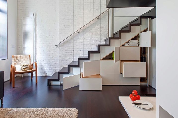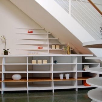 Мебелите “Стълбище” се сглобяват по същия алгоритъм. Често те се избират от собствениците на частни къщи, а за създаването им се използват стълби към втория етаж. Свободното пространство под стълбите може да се превърне в гардероб за съхранение на дрехи, килер за хранителни стоки или килер за битови нужди, библиотека или шкаф за вино. Когато правите мебел, не забравяйте за довършителните работи на стълбищната стена – тапицирайте гипсокартон или тапет.