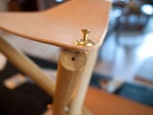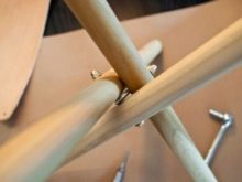 Изрежете 3 бъдещи крака от избрания материал с дължина 60 см със сечение 4 см. След това правим отвори от 0,6 см на всяка дръжка на разстояние 34 см от ръба. В краищата пробиваме дупка, за да фиксираме седалката. Ако сте избрали дървени крака, наситейте ги с ленено масло и боя. По този начин те ще издържат по -дълго..