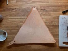 Седалката ще има триъгълна форма с дължина от всяка страна 28 см. Изрязваме тъканта с ножица, а ако седалката е планирана от кожа, тогава я изрязваме с нож. За по -лесно носене можете да оборудвате стола с колан. Столът може да се носи през рамо, като към него се прикрепи каишка. В един от ъглите на платното се прави контур за закрепването му.