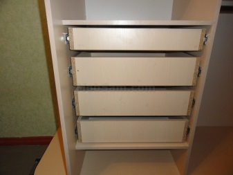 Чекмеджетата са отделна тема. Рамката на чекмеджетата се сглобява отвън. За това страничните и задните стени са закрепени заедно. След това дъното е прикрепено. След това към фасадата на бъдещото чекмедже е прикрепена дръжка и след това всичко е свързано заедно с чекмеджето..