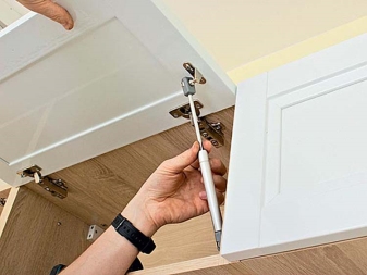 При монтажа е много важно точно да се измерват точките на закрепване на вратата и на стената на шкафа – това е единственият начин вратата да стои перфектно изправена. Първо, пантите са прикрепени към вратата, след това вратата се поставя към шкафа и се прави маркировка на страничната стена, където ще бъде прикрепена пантата. Много е удобно да направите това, ако механизмът на пантите може да бъде разглобен: и двете части са прикрепени към дървото поотделно и след това пантите са свързани.