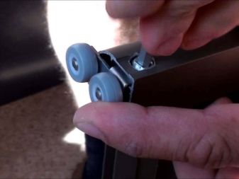 Освен това долният профил се прилага към дъното на шкафа (а ако шкафът е вграден – директно към пода). Не е нужно да го поправяте още. С асистент поставете първата врата в горния профил. Трябва да започнете с клапата, която ще се „търкаля“ отзад. Горното колело на вратата трябва да се побере в задната “релса”. След това трябва леко да стиснете долните колела с ръце и да ги вмъкнете в задния жлеб на долния водач. Второто (предно) крило се вкарва по същия начин.