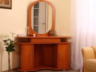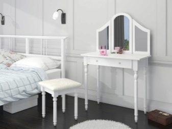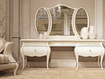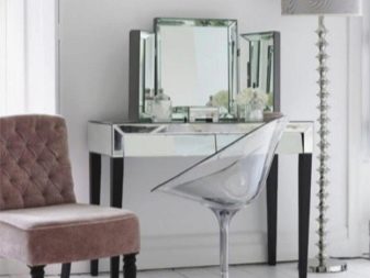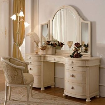 - Размер на огледалото. Тя може да бъде настолна или открита. Ако апартаментът няма нито едно голямо огледало, по -добре е да изберете тоалетка с него, за да можете да се видите в пълен растеж. Също така си струва да се обмисли необходимостта от три въртящи се огледала..