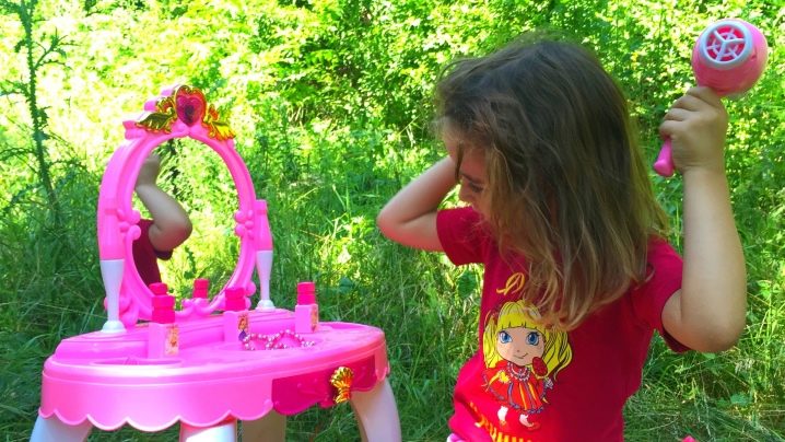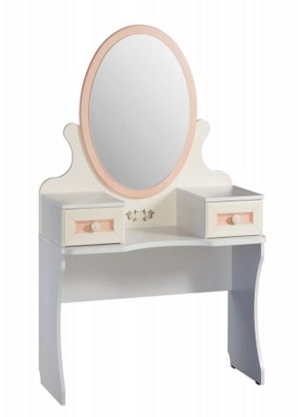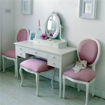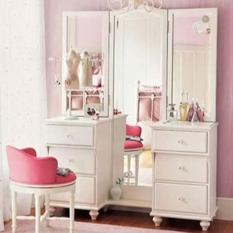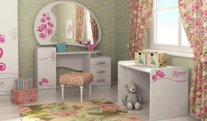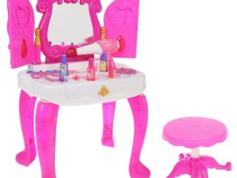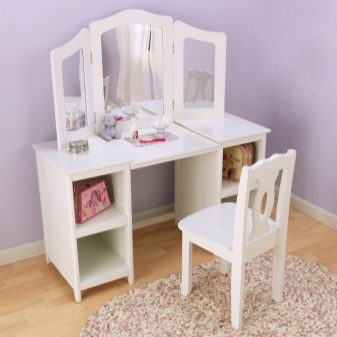 - Детска тоалетка. За растящите момичета тази мебел ще бъде много полезно и красиво допълнение към стаята. От ранна възраст той ще се научи да пази ред, слагайки нещата в кутии, да се грижи за себе си. Масата може да бъде с голямо разнообразие от цветове, украсена с апликации и шарки.