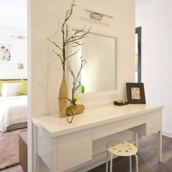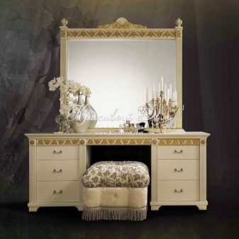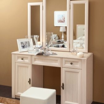 - Кейло с огледало. Една от неговите разновидности е маса с три огледала – решетка. Това е най -удобният дизайн, тъй като позволява на жената да се вижда от всички ъгли. Не е задължително огледалото да бъде прикрепено към масата. Тя може да бъде монтирана на стена или на пода.