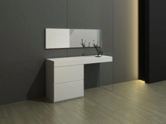 - Масата в стила на минимализма е модерна тоалетка без излишни детайли и декорации. Тя трябва да бъде възможно най -проста и функционална. Елементи с метална повърхност, стъкло.
