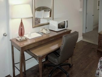 За да спестите място, е по -добре да изберете маса, която ви позволява да скриете стола в специална ниша. Моделите с малки размери могат да бъдат поставени в малка спалня или баня.