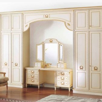 - Малка тоалетка. Такъв модел може хармонично да се впише в малка стая. Въпреки това той може да остане многофункционален. Моделът с нощни шкафчета отстрани ще ви позволи да поставите всичко необходимо в тях.