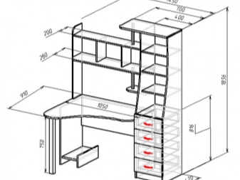 Минималната дължина на страничния плот на малки диагонални маси е от 80 до 90 см. Такива размери решават проблема с местоположението на основните компоненти на компютъра, както и на допълнителни устройства. Височината на надстройките може да бъде почти всяка, при условие че не покриват прозореца. Най -ефективно използваното пространство се намира на разстояние малко над половин метър. Рафтовете по -горе обикновено са пълни с предмети, които се използват по -рядко. Максималната дължина на страничните работни плотове е около 120 см. Рафтовете обикновено се монтират отстрани..