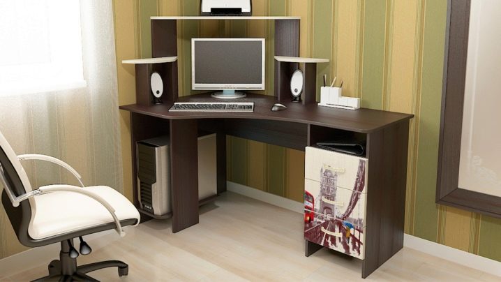 На масата в ъгъла с вградени рафтове можете да позиционирате компютъра с всички джаджи и аксесоари и всички елементи, които сте използвали, за да имате под ръка. Има много компактни модели с долни и странични рафтове..