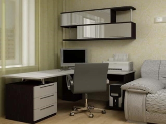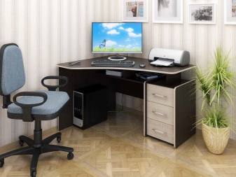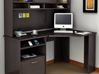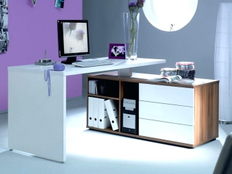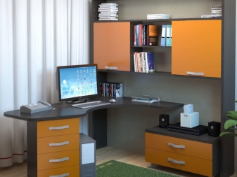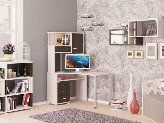 Има много опции за ъглови маси за компютър, следователно, почти всяка идея може да бъде реализирана за голямо разнообразие от помещения. Възможността за допълнителен избор на странични маси, рафтове, чекмеджета, стенни шкафове прави масите различни един от друг. Можете да съхранявате всякакви малки неща и необходими приспособления в добавки. Висящите шкафове позволяват не само да разтоварите плота на масата, но и да скриете всичко, с което работите, от любопитни очи.