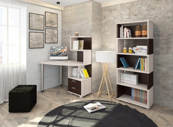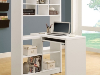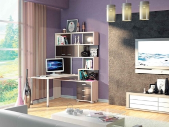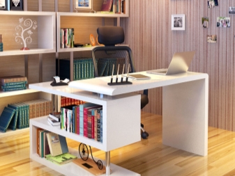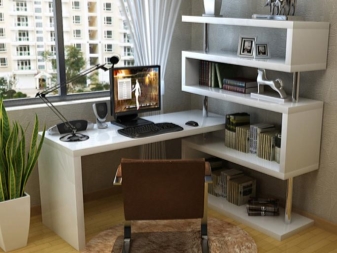 Ъглови маси с рафтове често се избира за използване в домашния офис. След като сте избрали височината на стелажа, формата и броя на рафтовете, можете да поставите всички папки с документи, книги и други необходими неща върху него. Рафтовете за рафтове могат да поставят принтер и високоговорители. В ъгъла има място за компютърно бюро със странични масички, които също пасват на много неща, от които се нуждаете за работа или учене..