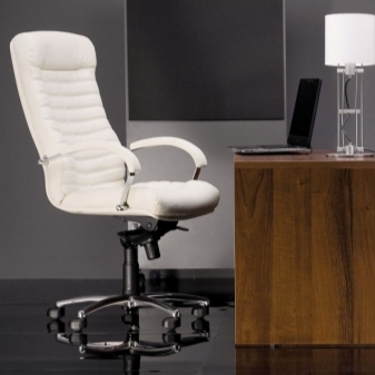 Класическият бял изпълнителен стол е вечна класика. Белите модели са изработени от кожа. Забележителното е, че в този цвят можете да намерите не само ултрамодерни модели, но и фотьойли в стил ампир..