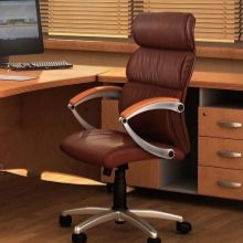 Висококачествен кожен стол в изпълнителен стил може да бъде закупен на цена от 16 000 рубли на парче. Моделът е оборудван с всички необходими параметри: възможност за регулиране на височината и ъгъла на облегалката, люлеещ се механизъм. Подлакътниците също са тапицирани с кожа. Гърбът е допълнен с възглавница под долната част на гърба.