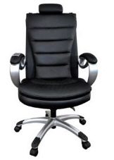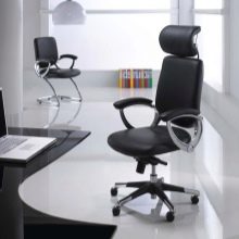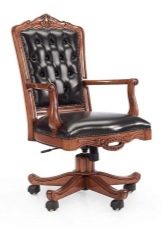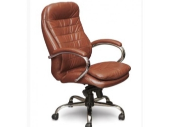 Висококачествен кожен стол в изпълнителен стил може да бъде закупен на цена от 16 000 рубли на парче. Моделът е оборудван с всички необходими параметри: възможност за регулиране на височината и ъгъла на облегалката, люлеещ се механизъм. Подлакътниците също са тапицирани с кожа. Гърбът е допълнен с възглавница под долната част на гърба.