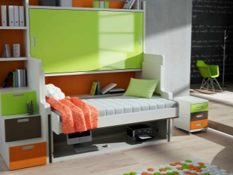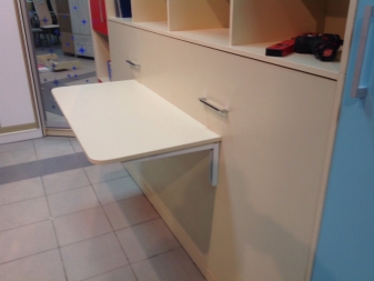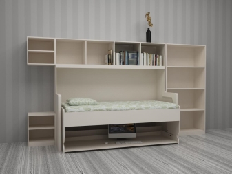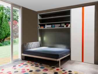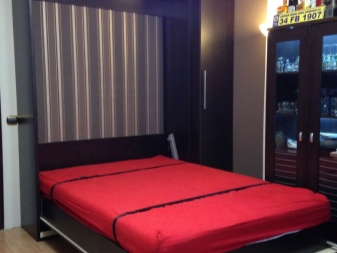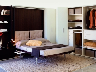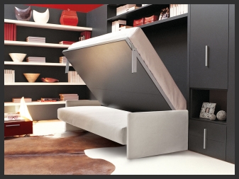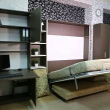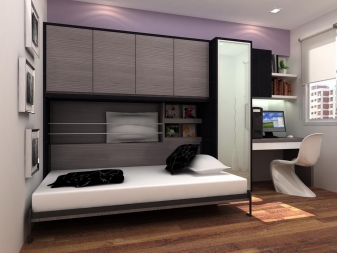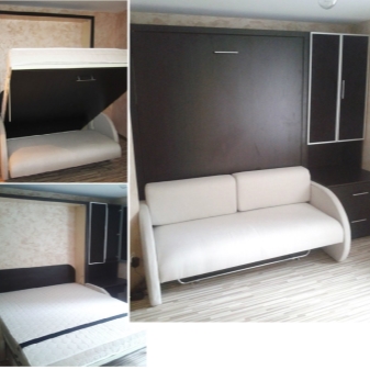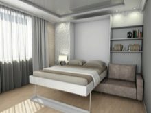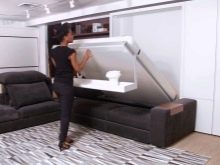 Например, има разнообразие, което добре маскира., се комбинира с диван. Говорим за вертикална сгъваема конструкция, направена в същия цвят и стил с централната част на дивана, която може да бъде поставена в специална ниша до гардероба. В сгънато състояние ансамбълът изглежда естествен и уютен.