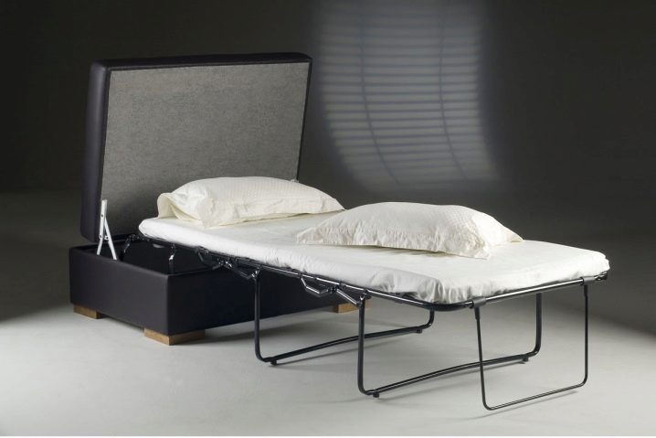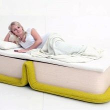 - Един от най-интересните и привличащи вниманието модели е пуф легло. Заслужено се нарича най -модерната мида в света. В сгънато състояние прилича на мека тахта, чиито размери са много компактни. Но ако повдигнете капака, вътре е най -често срещаната метална конструкция на краката с удобен матрак, който се плъзга вертикално. Моделът може лесно да се трансформира обратно: просто трябва да го сгънете като обикновено сгъваемо легло и да го поставите вътре в пуфа.