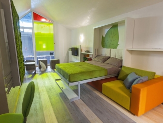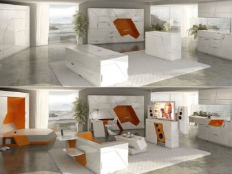 - Американска фирма Ресурсни мебели разработи концепцията за пространствено решение, което се превърна в един вид и много удобно ноу-хау: един обект, който заема минималното пространство в стаята, може да действа като легло с рафтове, както и като работна, трапезарна и дори масичка за кафе.