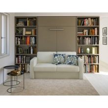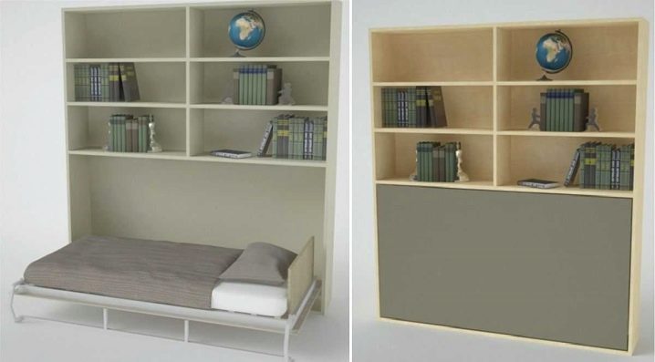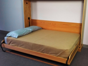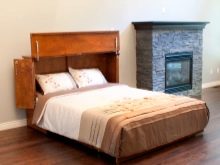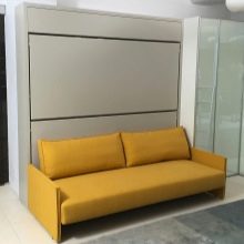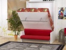 - Вертикален дизайн -“възрастен” двоен гардероб-легло-трансформер, чиято табла е фиксирана към стената, а основната част е поставена на цялата й височина. Хоризонталното легло е проектирано да се използва като единично легло, монтирано отстрани към стената. Предимството на хоризонталния модел е, че пространството на стената остава незаето и можете да поставите снимки или рафтове за книги върху него, освен това в разгънато състояние изглежда по -малко обемист и заема малко място.