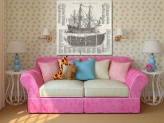 Специално внимание се отделя на последната точка. Светлите и бели дивани са украсени с контрастни възглавници в цвета на младата зеленина. Ярките модели, от друга страна, стават по -приглушени поради аксесоарите в неутрален нюанс..