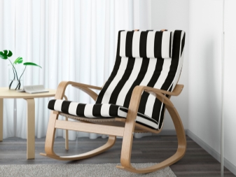 - Прост люлеещ се стол Poeng при хубаво време можете да го поставите на балкон или лоджия. Поради своята компактност, той не заема много място, а в компания с градински цветя обикновена лоджия може лесно да се превърне в малка оранжерия за отдих. Текстилните капаци, както обикновено, могат лесно да се свалят, почистват и перат в пералня, а специална импрегниране за дървообработване ще предпази продукта от висока влажност при облачно време.
