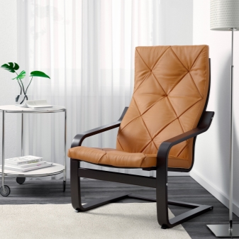 - Серия Poeng предлага голям избор от столове за всеки вкус и възраст. На първо място, това са люлеещи се столове, изработени от различни материали. Рамката на по -простия модел е изработена от бреза, възглавниците на седалките са увити в плътно текстилно покритие. По -“солидният” модел “Poeng” изглежда впечатляващо благодарение на масивната дъбова рамка и покривало от естествена кожа. Може да се използва като кресло за камина и веднага да се закупи в комплект с подложка за крака, което е особено удобно..