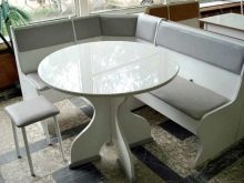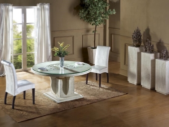 В съвременния кухненски дизайн той се използва много често модели с кръгли стъклени плотове. Те могат да бъдат не само прозрачни, но и матови с деликатен млечно бял цвят. Основното предимство на стъклото е това лесен за грижи, не се деформира от влага, не се страхува от влага, лесно се почиства и има уважаван външен вид. В допълнение, стъклото има свойството на отражение, което ви позволява визуално да разширите пространството на стаята..