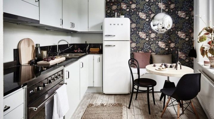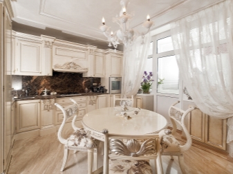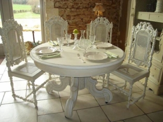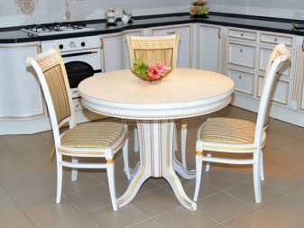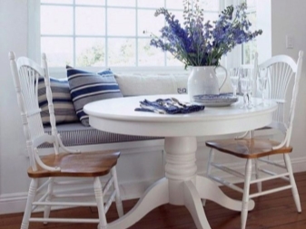 Бяла кръгла или полукръгла дървена маса с патина идеално ще се впише в модерната изтъркан стил, но ако кухненската площ е твърде малка, тогава изборът на кръгъл модел няма да бъде най -рационалното решение. В малка стая полукръгла или дори овална маса ще изглежда по -хармонично..