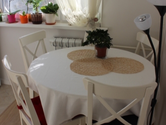 - Работен плот с диаметър 80 см или 90 см може удобно да побере двама души. Този модел е подходящ за малка кухня. Ако моделът осигурява механизъм за сгъване, тогава четиричленно семейство може лесно да се побере на такава маса;