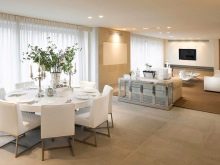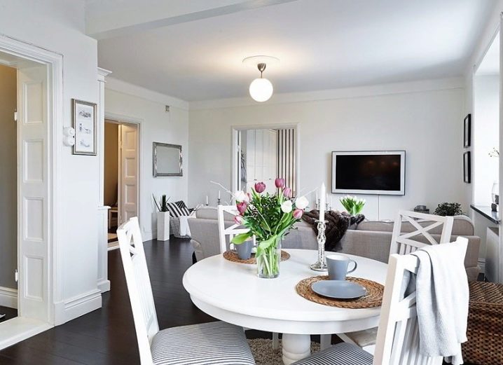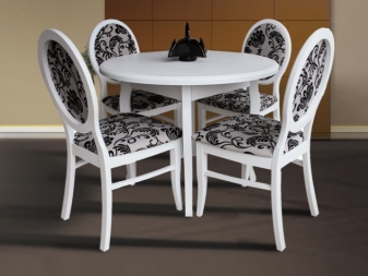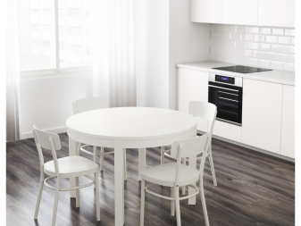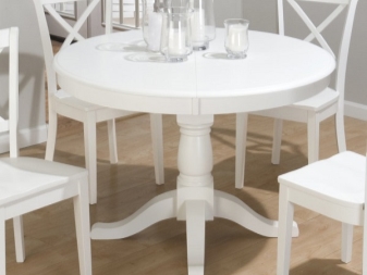 Голяма бяла маса с кръгъл плот е чудесен вариант за всекидневна или просторна кухня, където тя ще се превърне в централната част на интериора. В кухнята кръгла маса за хранене ще създаде атмосфера на чистота и изтънченост, такъв избор ще бъде идеален за кухни, декорирани в класически, романтичен или селски стил.