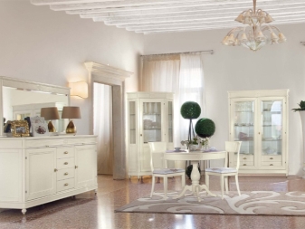 Не забравяйте, че ако изберете бели мебели за интериора, тогава трябва да добавите ярки акценти към дизайна с помощта на осветление, текстил, завеси, тапицерия на столове и други декоративни елементи..