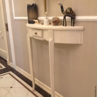 В просторна, светла спалня, малка овална конзолна маса с ослепително бял плот ще изглежда перфектно, на която можете да поставите ценни неща, семейни снимки, антики и вашите лични колекции. Също така, малките полукръгли конзолни маси могат да се превърнат в акцент в дизайна във вътрешността на коридора или банята..