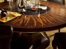 Дървена маса, в центъра на която има оригинален въртящ се подиум, ще направи всеки дом по -привлекателен. Ще бъде много приятно да седнете зад такива мебели. На подиума най -често се излагат различни ястия, всеки, който желае, може да ги достигне, като просто завърти стойката в тяхна посока.