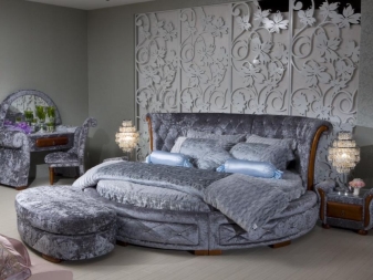 Кръгло бароково легло трябва да има помпозно табла. Тапицерията трябва да е плат, кадифена, с дълбок благороден цвят, в хармония с декора на стаята. Обикновено за „царствен“ дизайн те избират наситени кафяви, бордо, тъмно черешови, тъмно лилави нюанси. Добро решение би било да се допълни леглото с мек пуф и други интериорни елементи, направени в същия стил..