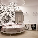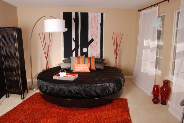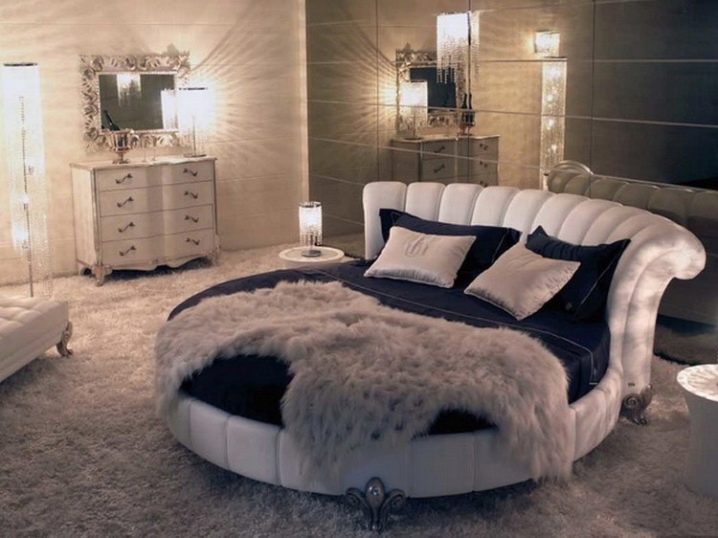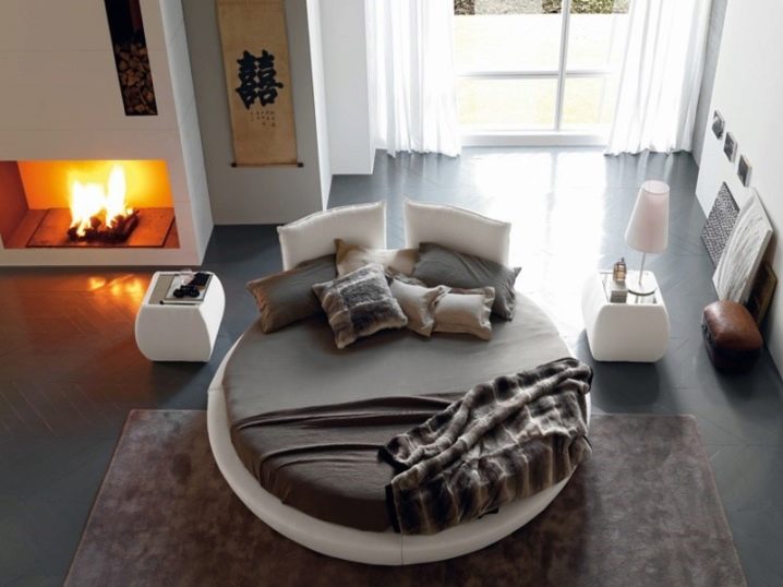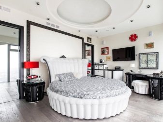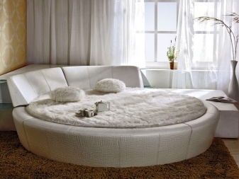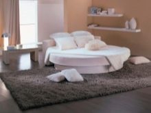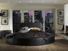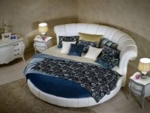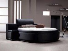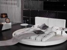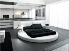 Кръглото легло се вписва идеално в модерен стил. Универсален вариант е бяло или черно кожено легло. Тези цветове могат лесно да се впишат във всеки интериор..