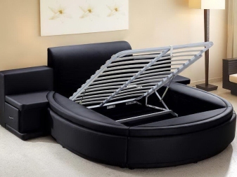 Опциите за дизайн на кръгли легла са различни. Гърбът може да бъде малък или масивен, прост или сложен. Удобни модели с ъглово табло. Обикновено този елемент е оборудван с допълнителни рафтове, на които е удобно да се поставят осветителни тела, будилници и други важни дреболии..