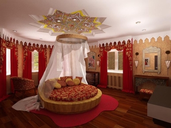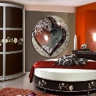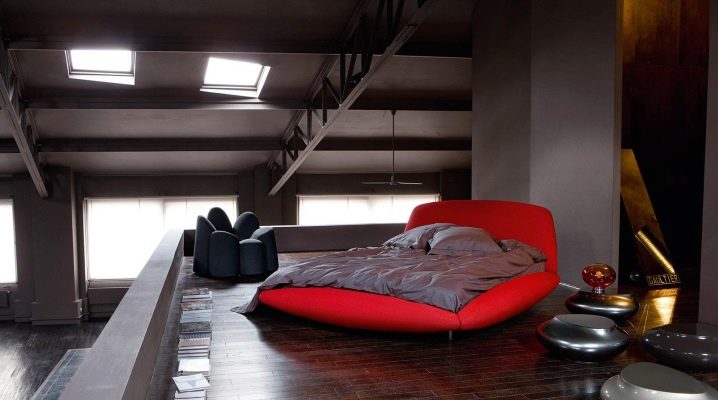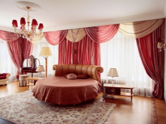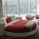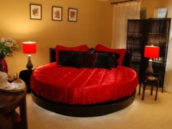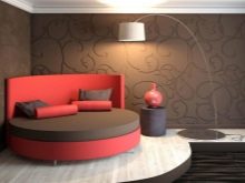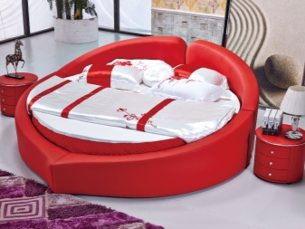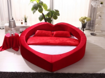 Най -смелото решение е да закупите червено кръгло легло. Такава мебел ще се превърне в основен акцент в стаята, особено ако това е опция за дизайн във формата на сърце. Декорацията на стаята в този случай трябва да се извършва в сдържани цветове..