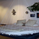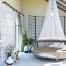 Оборудван с ефирен полупрозрачен балдахин и висящи кръгли легла. Обикновено такива опции се използват в селски къщи и на тераси..