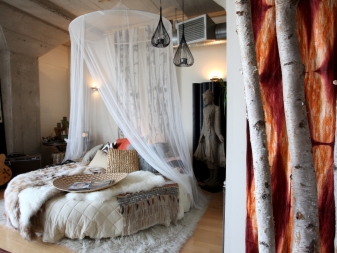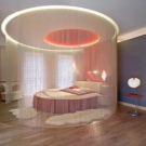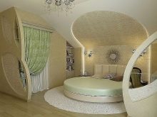 - Зониране. Леглото с кръгла форма привлича вниманието, превръщайки се в централната част на стаята. В студийните апартаменти този нюанс е особено важен за компетентното зониране на стаята..