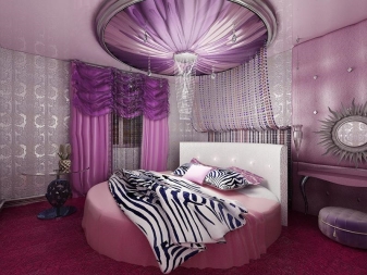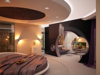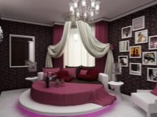 Ако размерът на стаята позволява, можете да направите дизайна по -шокиращ, като поставите легло на подиума или добавите кръгла пейка, направена с легло в същия стил..